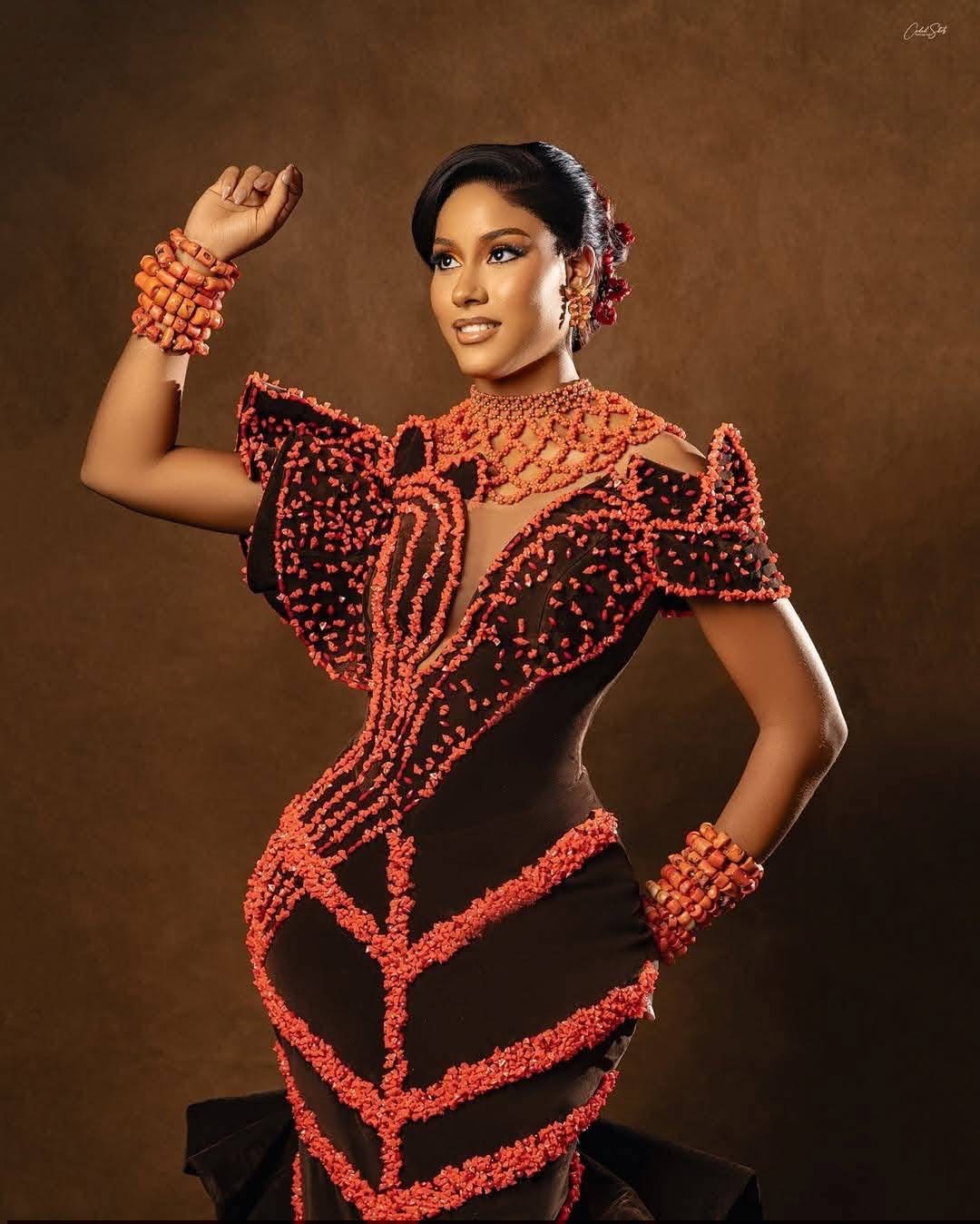 Be the first to review “Sleycrafts Coffee brown Swede with native beads fitted dress for Traditional wedding”